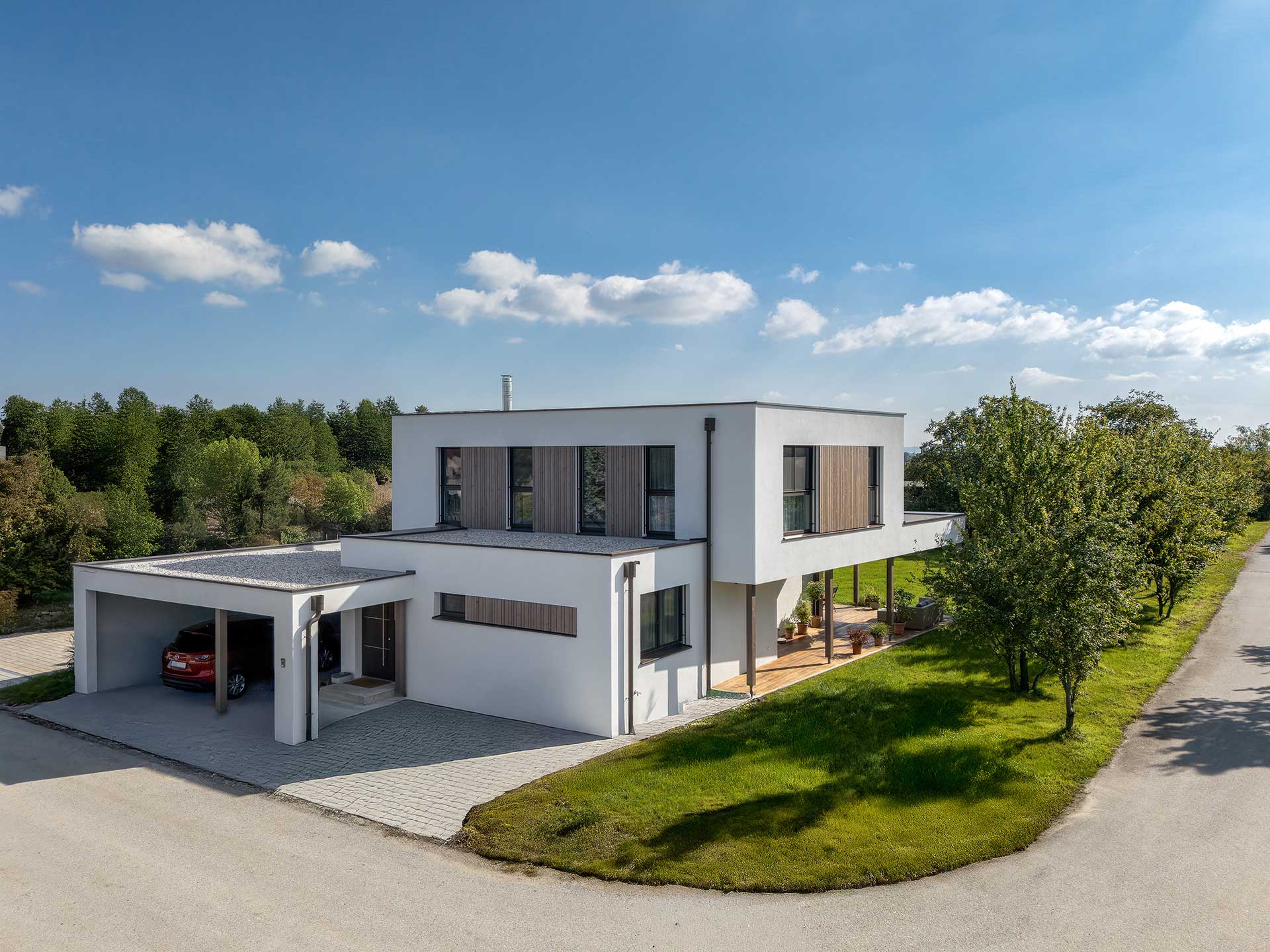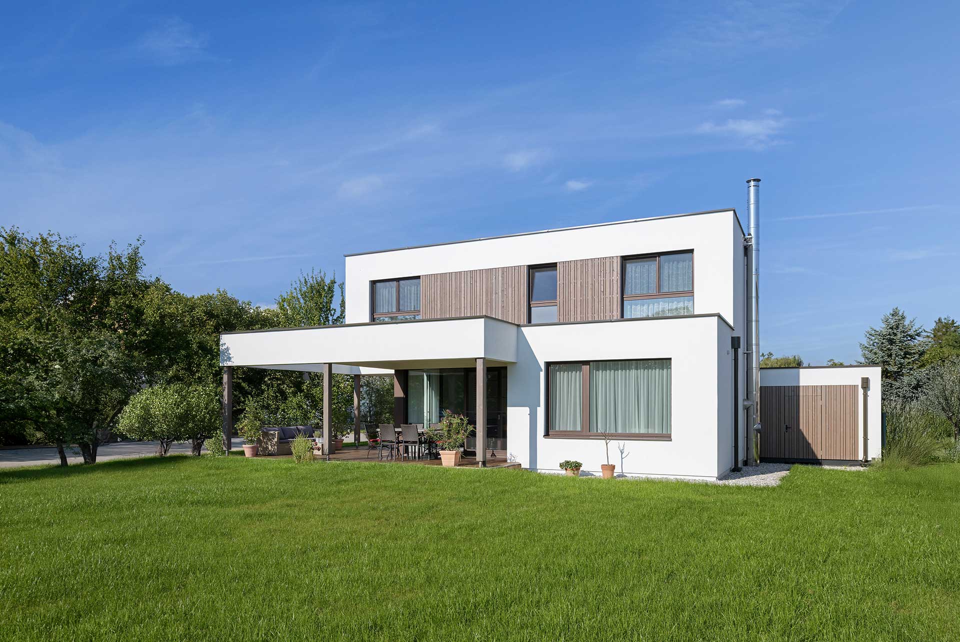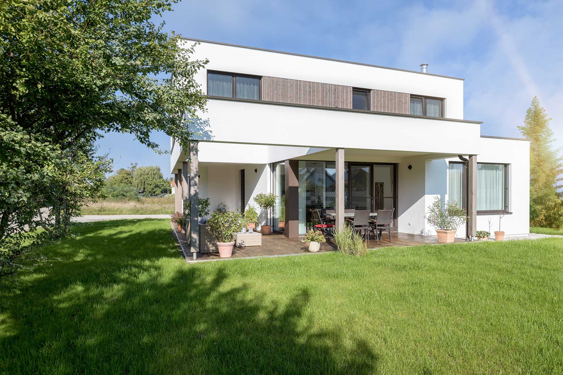 Dieses moderne Stadthaus auf dem Land präsentiert sich in charakteristischer Magnum-Architektur, die durch das typische Wechselspiel von Holzschalungsfeldern und Putzfassade besticht. Eine großzügige Terrasse verschmilzt nahtlos mit der Gartenfläche und schafft so einen fließenden Übergang zwischen Innen- und Außenbereich.