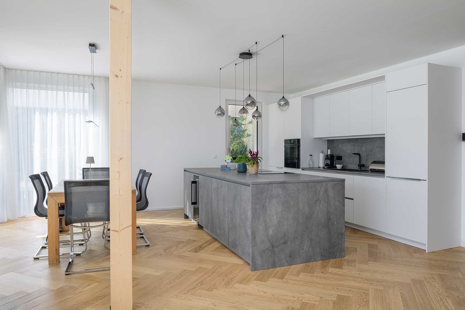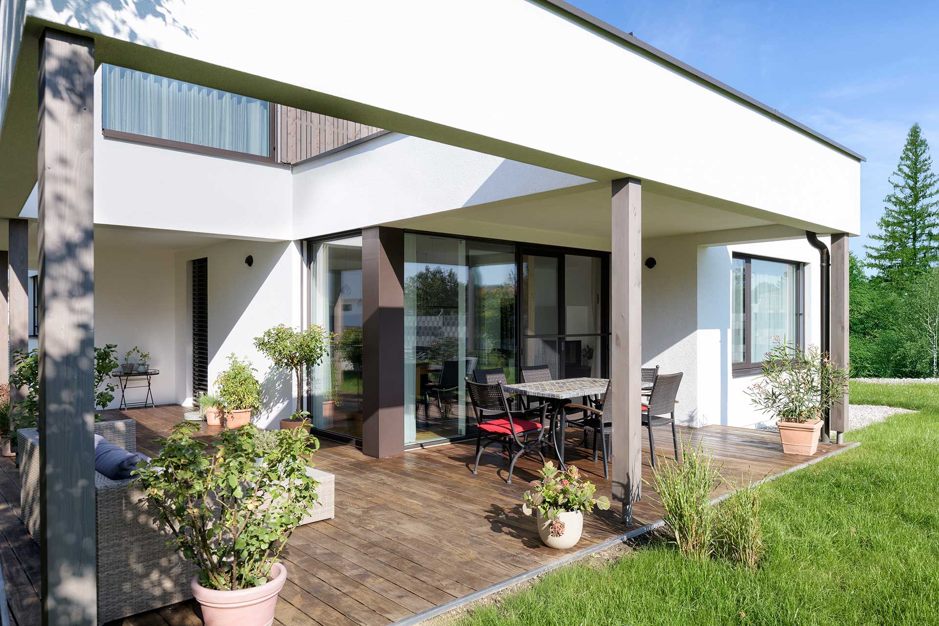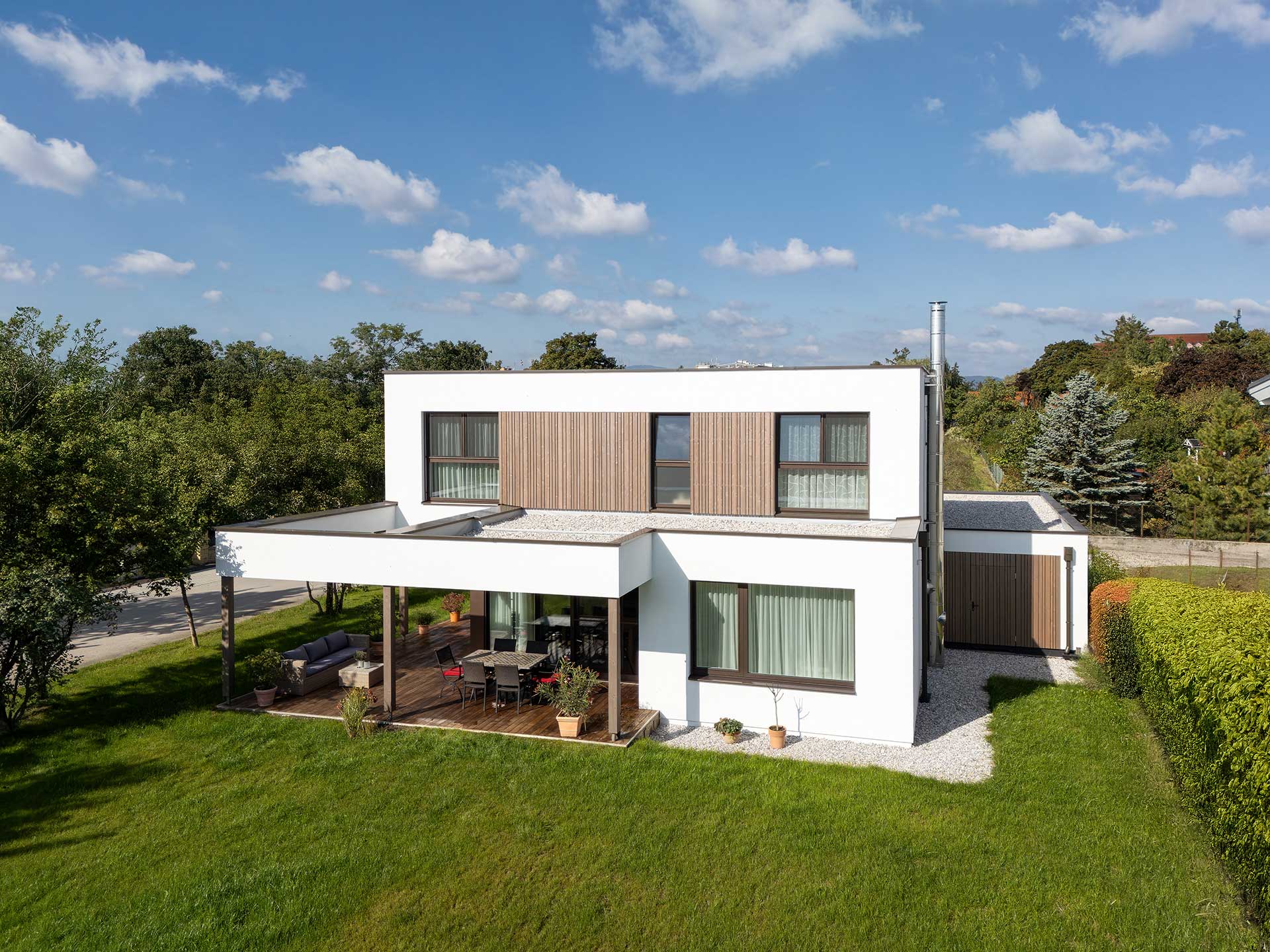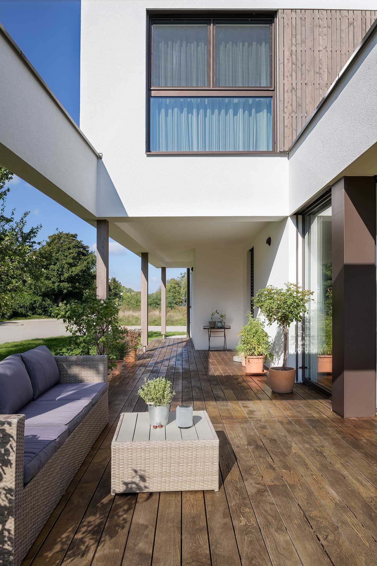 Dieses moderne Stadthaus auf dem Land präsentiert sich in charakteristischer Magnum-Architektur, die durch das typische Wechselspiel von Holzschalungsfeldern und Putzfassade besticht. Eine großzügige Terrasse verschmilzt nahtlos mit der Gartenfläche und schafft so einen fließenden Übergang zwischen Innen- und Außenbereich.