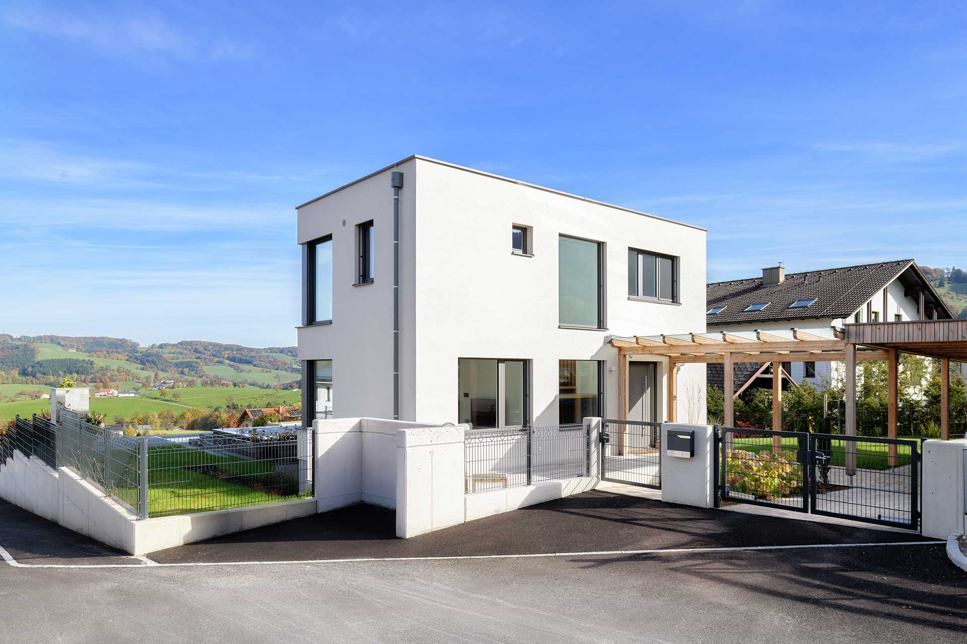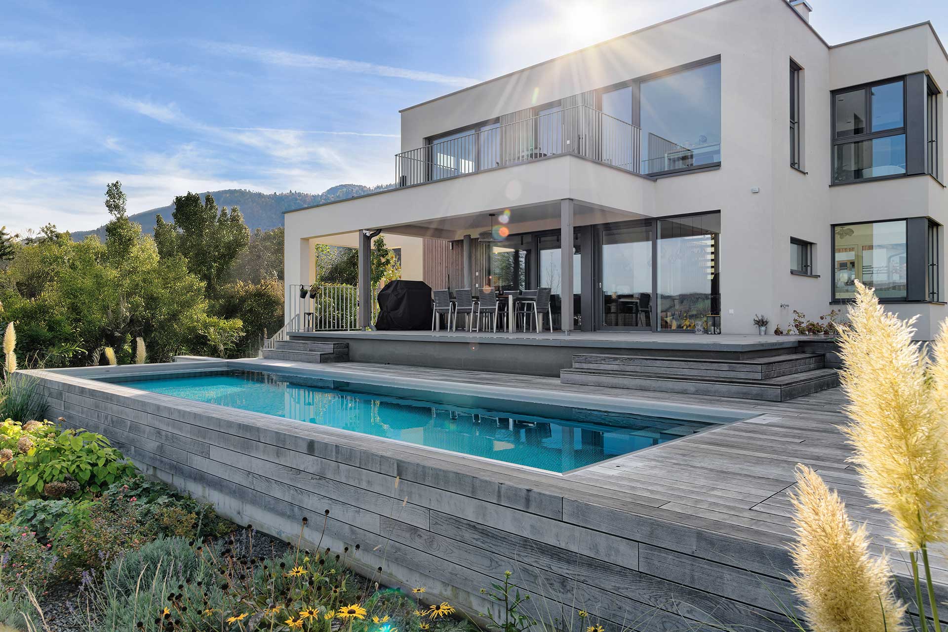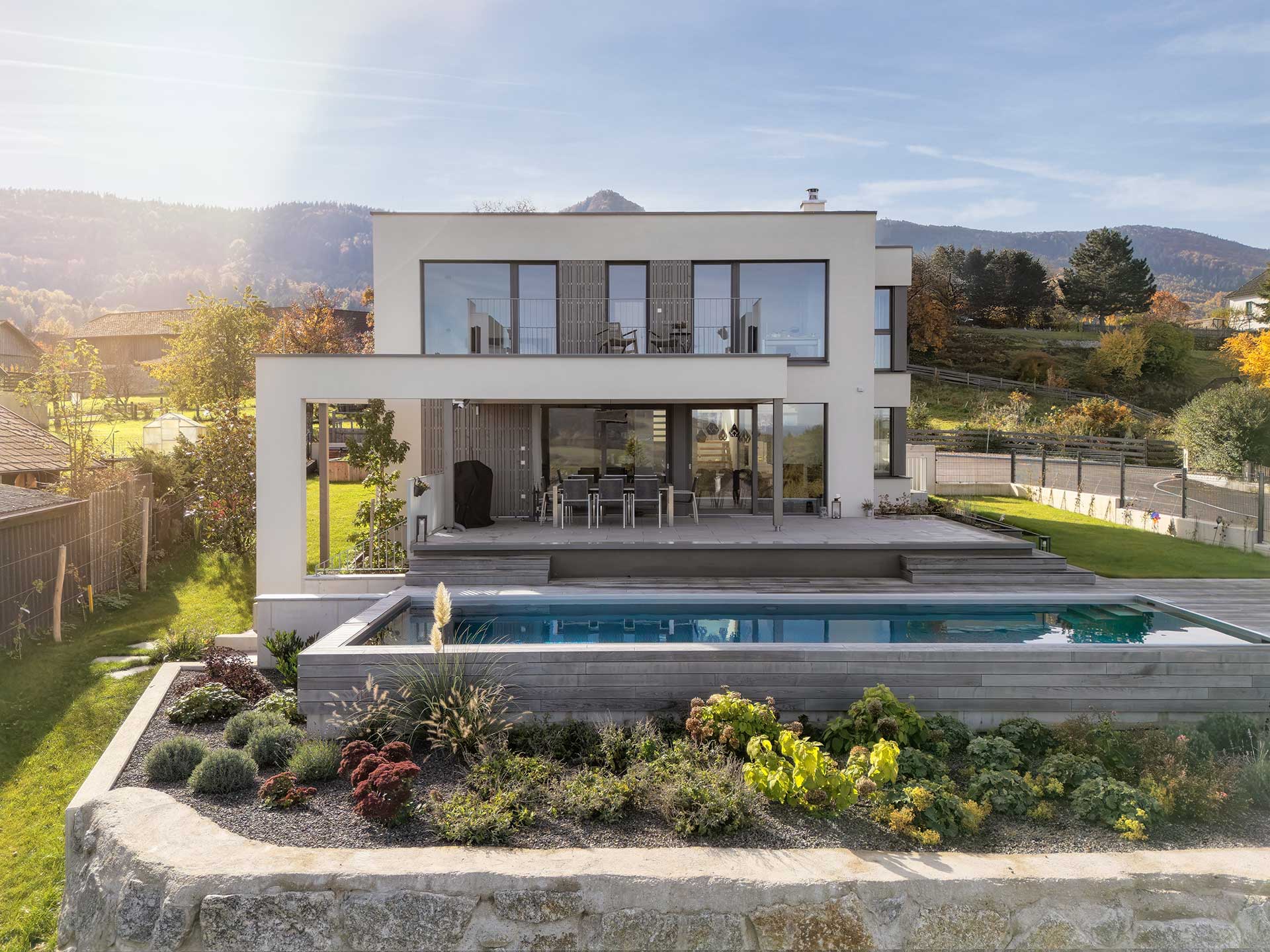 Klare, moderne Flachdach-Architektur inmitten einer ländlichen Idylle. Balkon und Terrasse öffnen den Blick auf sanfte Hügel, die zum Träumen einladen. Der unmittelbar angrenzende Pool schafft eine Oase der Ruhe und Eleganz. Im Innenraum trifft zeitgemäßes Design auf natürliche Wärme – verkörpert durch eine edle Holz-Innenstiege. Ein Zuhause, das modernes Wohnen mit unverfälschter Naturverbundenheit verbindet.