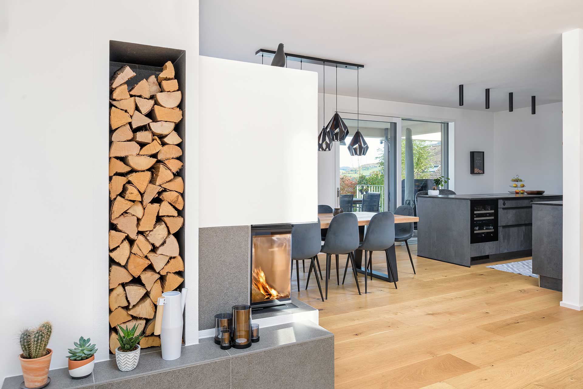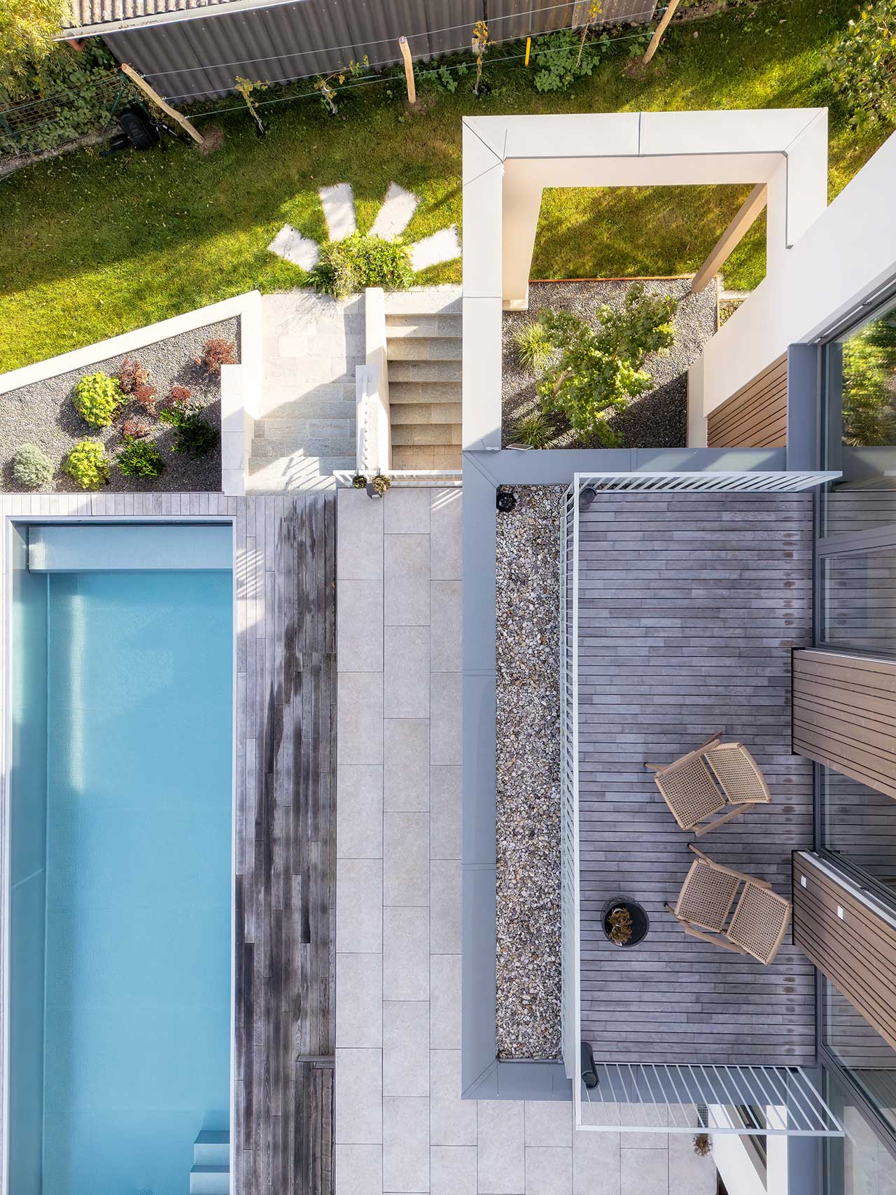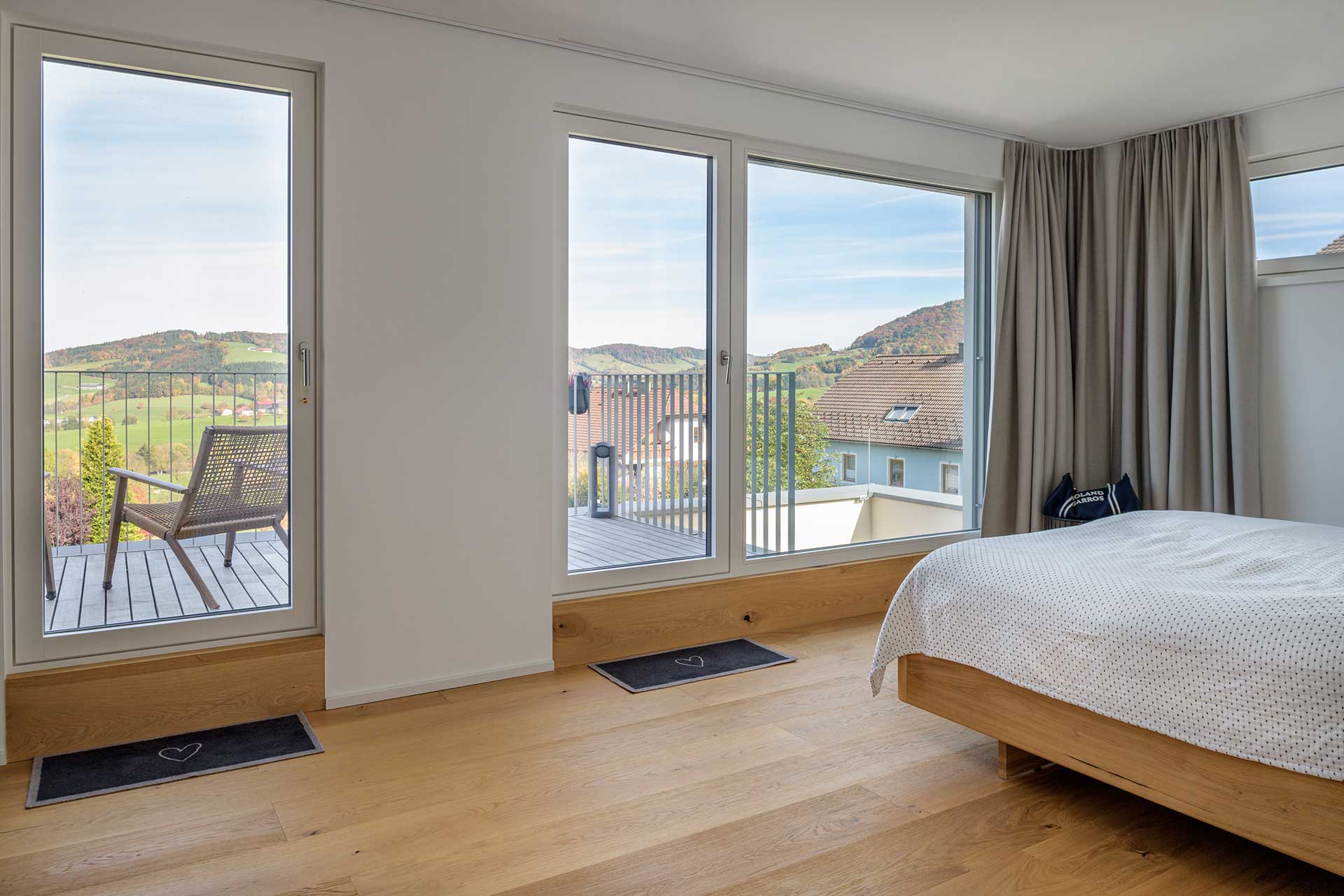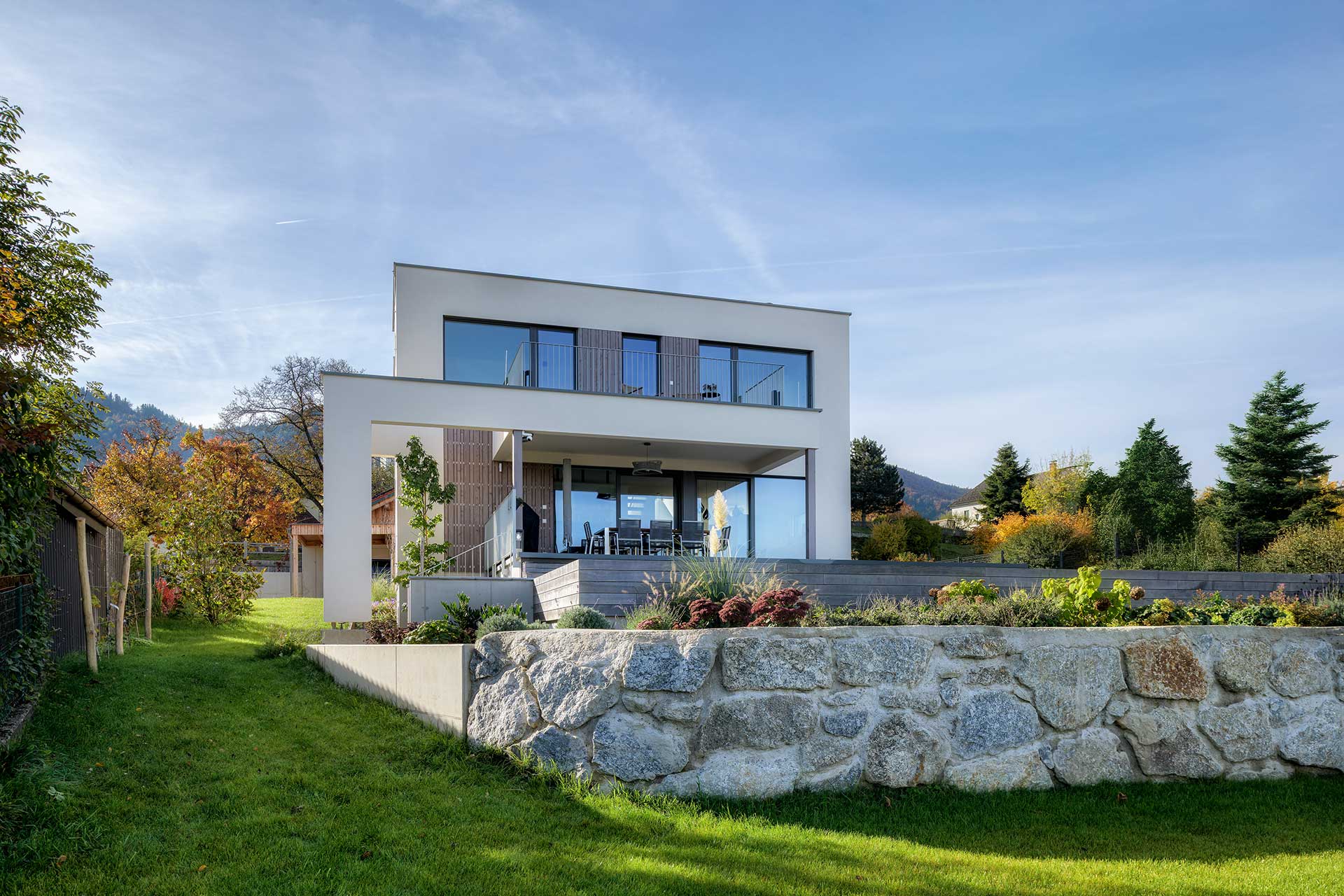 Klare, moderne Flachdach-Architektur inmitten einer ländlichen Idylle. Balkon und Terrasse öffnen den Blick auf sanfte Hügel, die zum Träumen einladen. Der unmittelbar angrenzende Pool schafft eine Oase der Ruhe und Eleganz. Im Innenraum trifft zeitgemäßes Design auf natürliche Wärme – verkörpert durch eine edle Holz-Innenstiege. Ein Zuhause, das modernes Wohnen mit unverfälschter Naturverbundenheit verbindet.