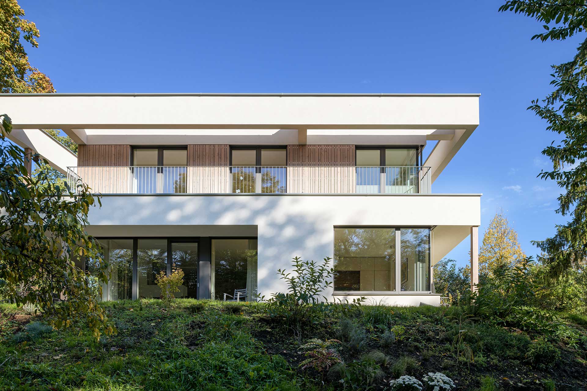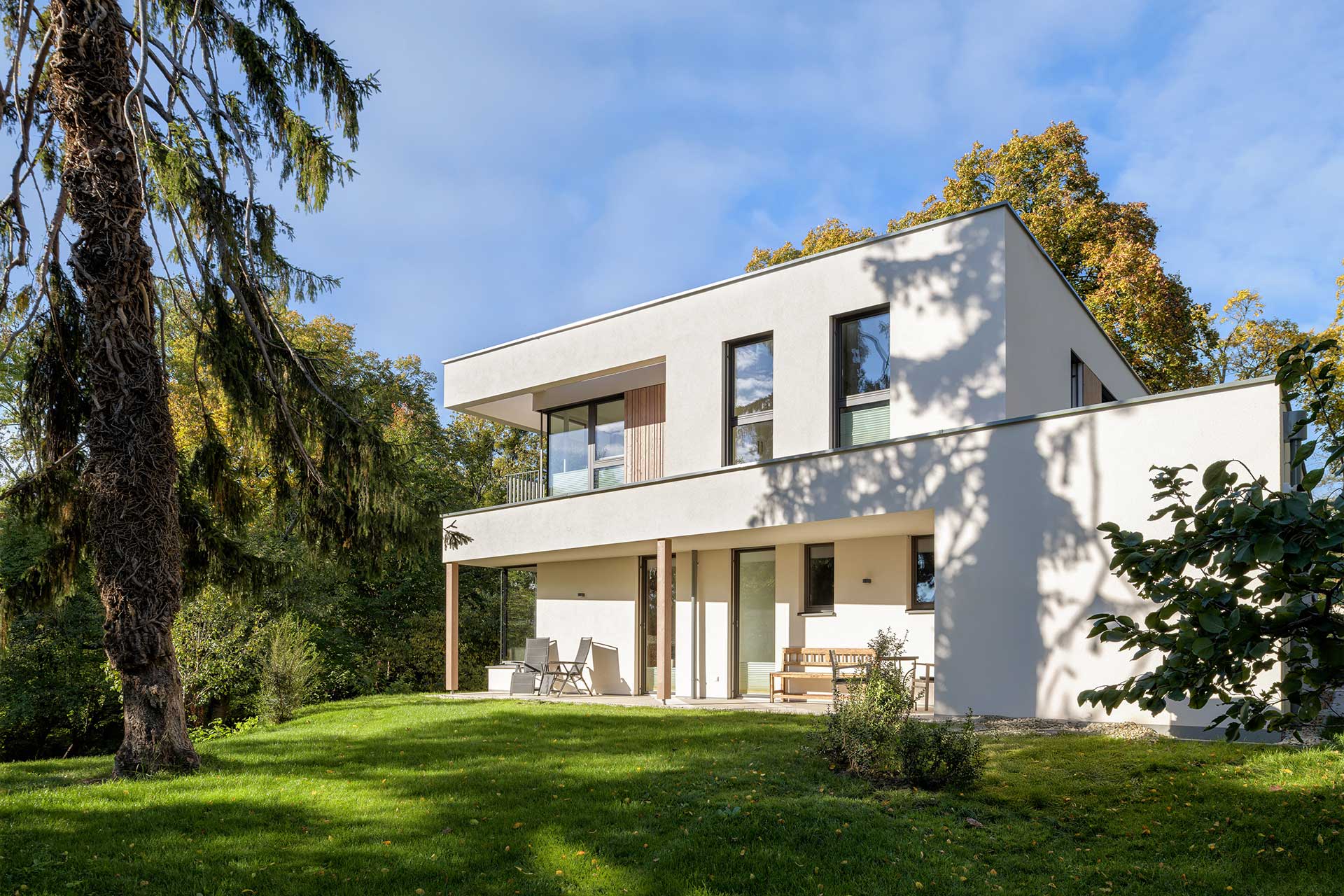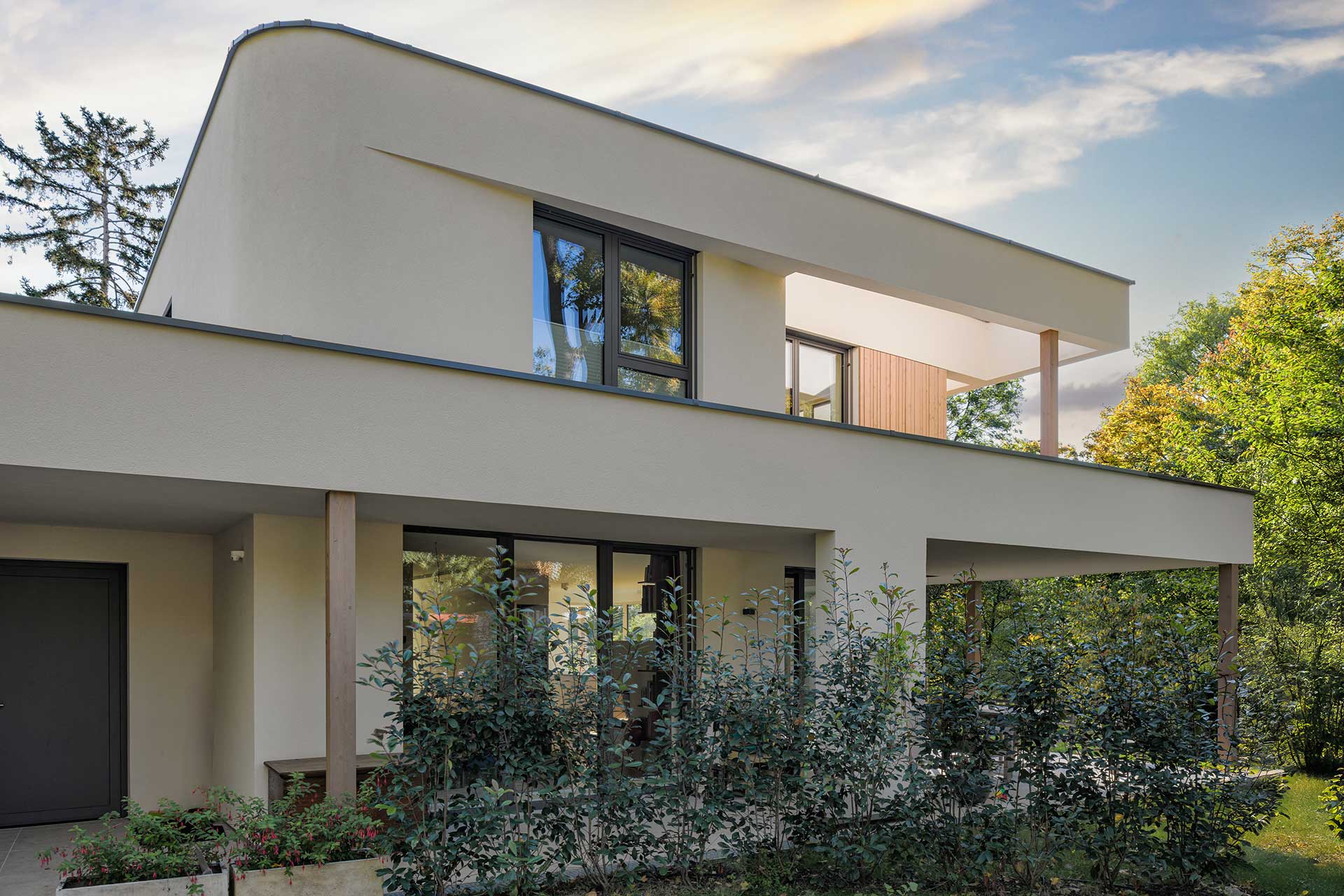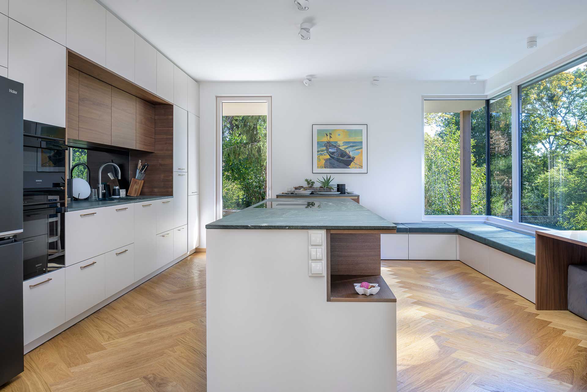 Die moderne Stadtvilla besticht durch ihre ruhige Lage im Grünen, umgeben von einer parkähnlichen Gartenanlage. Die Fassade mit eleganten Bügel- und Holzschalungselementen wird durch warme, moderne Farbtöne bei Fassade und Fenstern ergänzt. Die hochwertige Designerküche mit integriertem Windowseat verbindet Ästhetik und Komfort für modernes Wohnen.