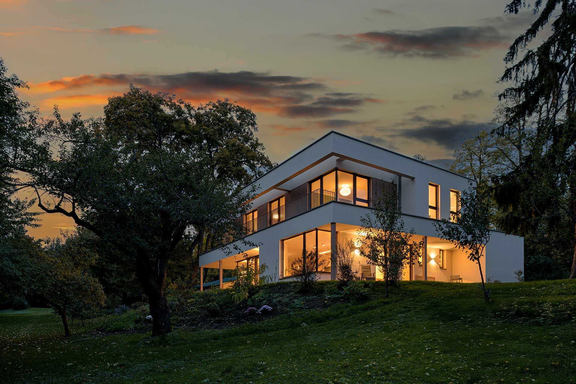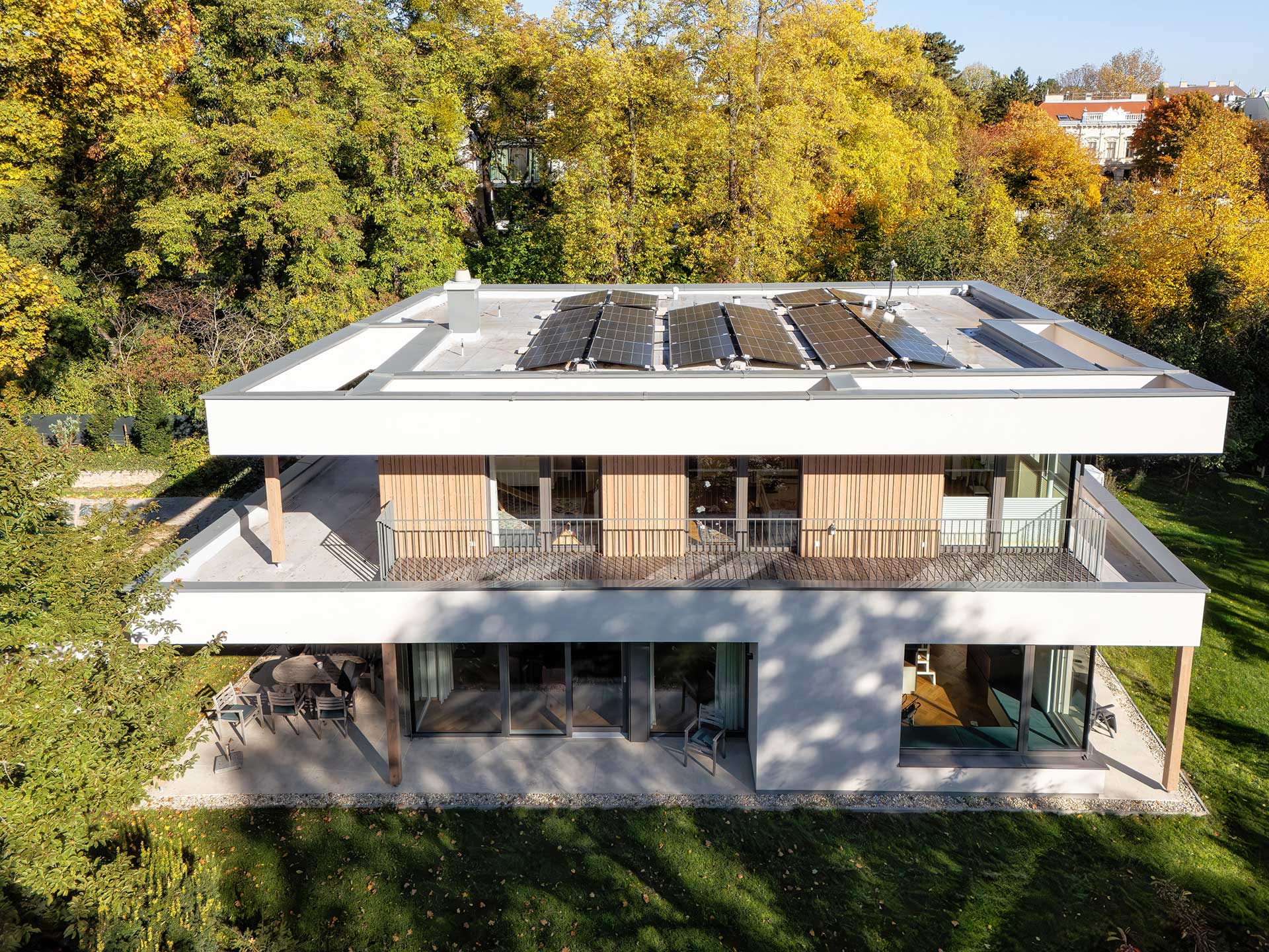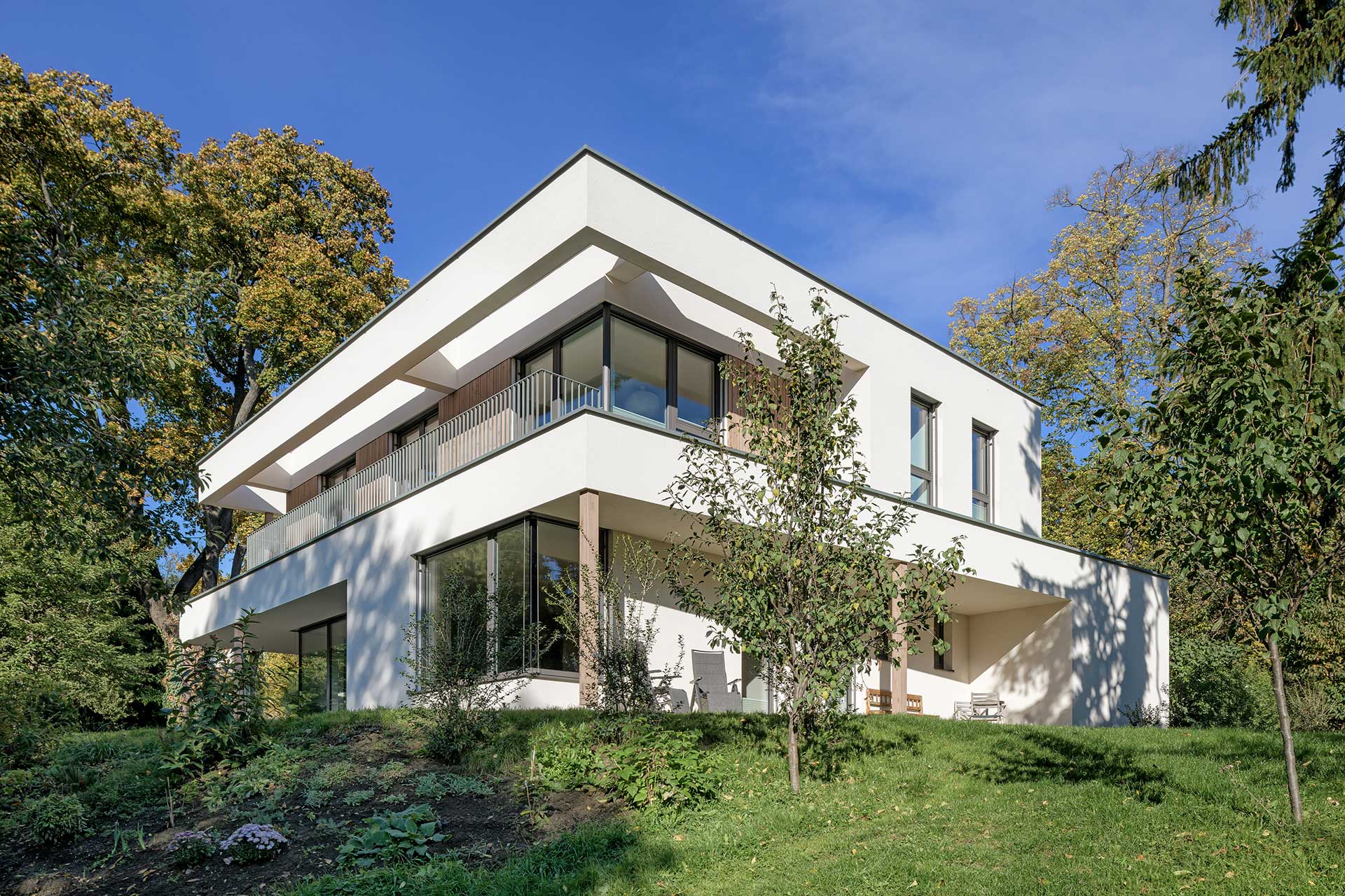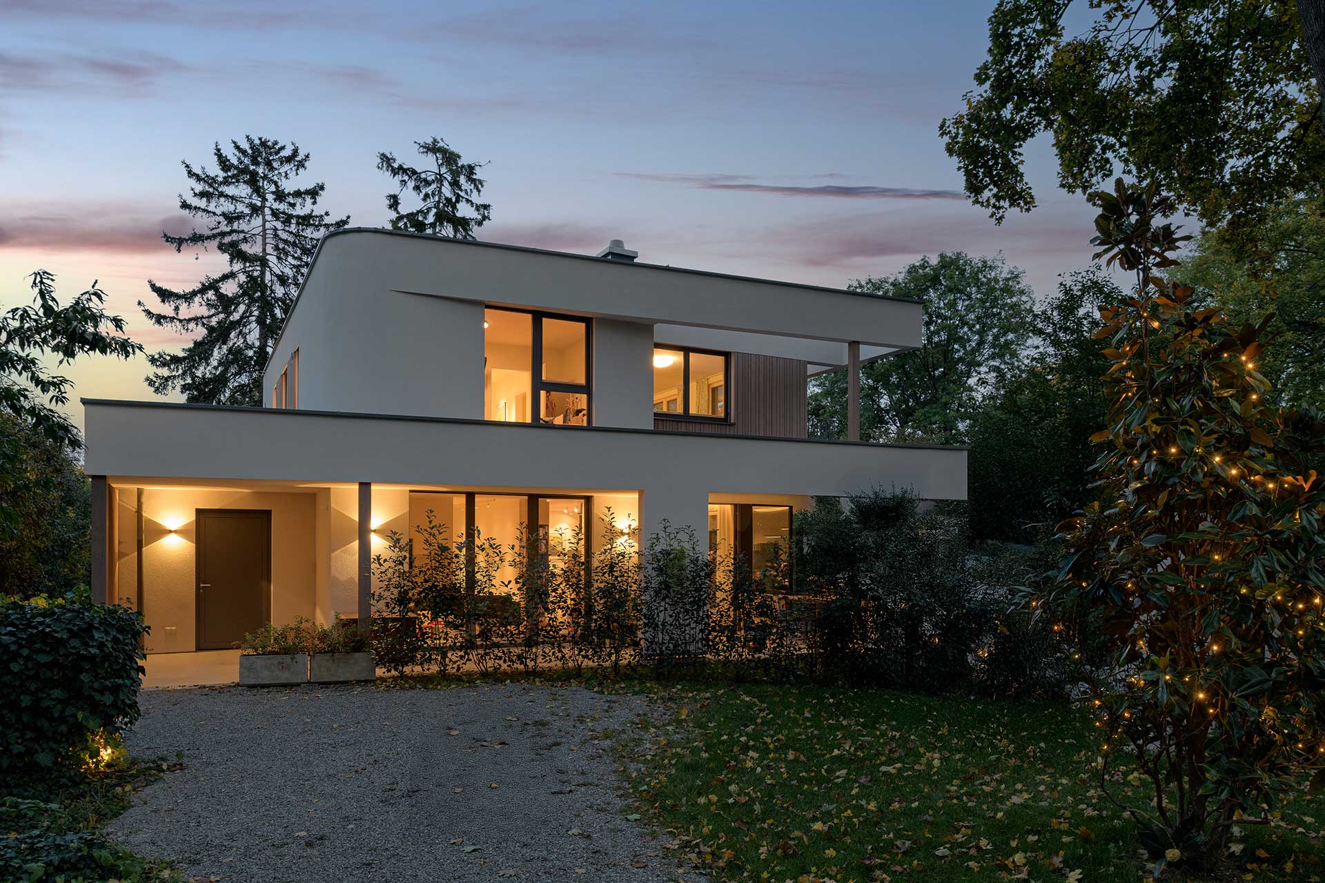 Die moderne Stadtvilla besticht durch ihre ruhige Lage im Grünen, umgeben von einer parkähnlichen Gartenanlage. Die Fassade mit eleganten Bügel- und Holzschalungselementen wird durch warme, moderne Farbtöne bei Fassade und Fenstern ergänzt. Die hochwertige Designerküche mit integriertem Windowseat verbindet Ästhetik und Komfort für modernes Wohnen.