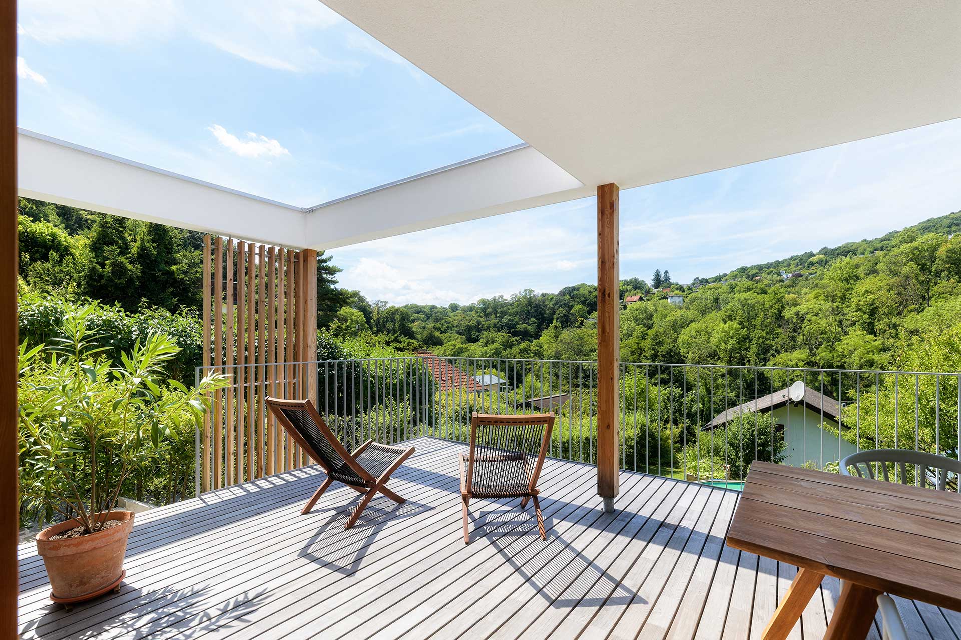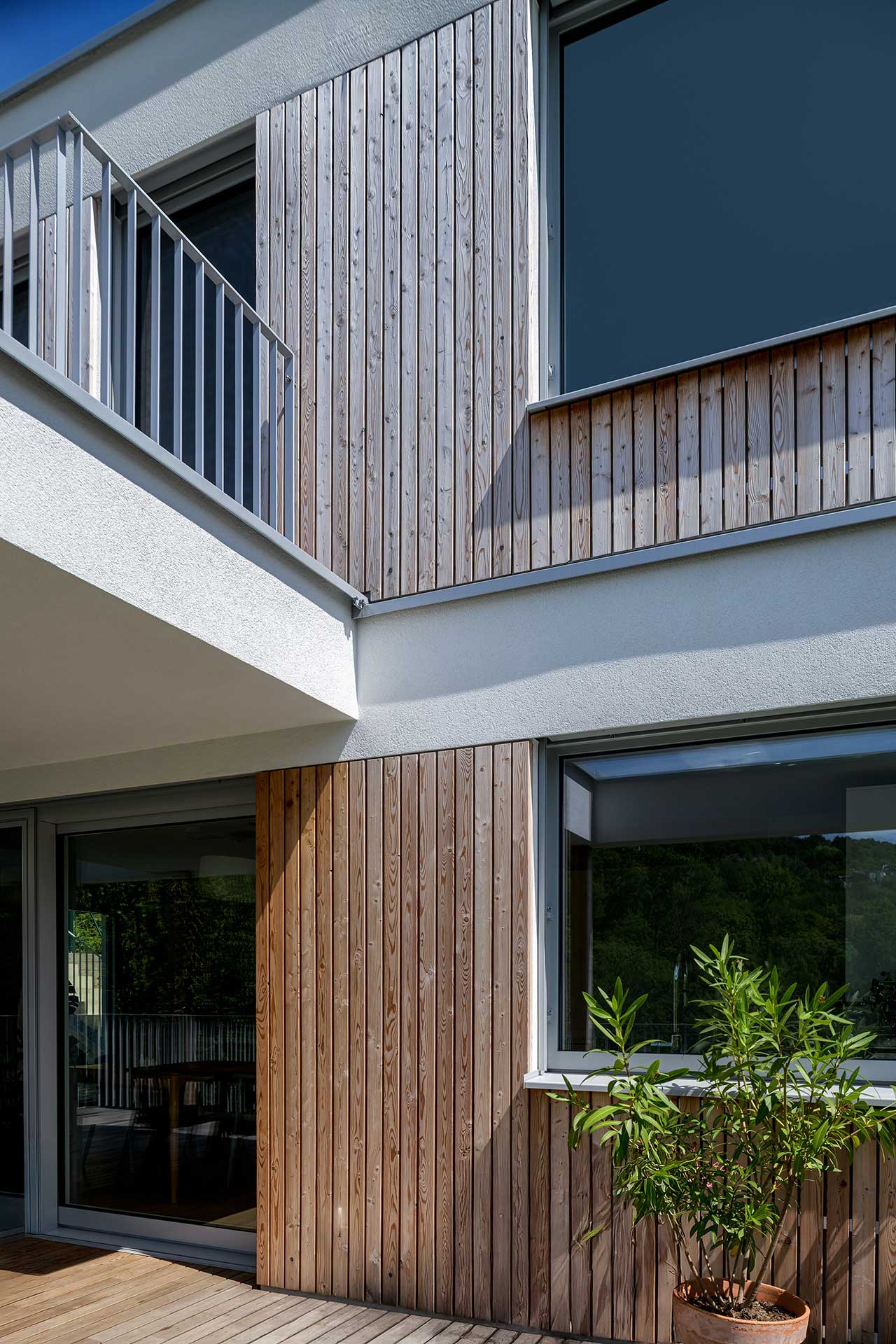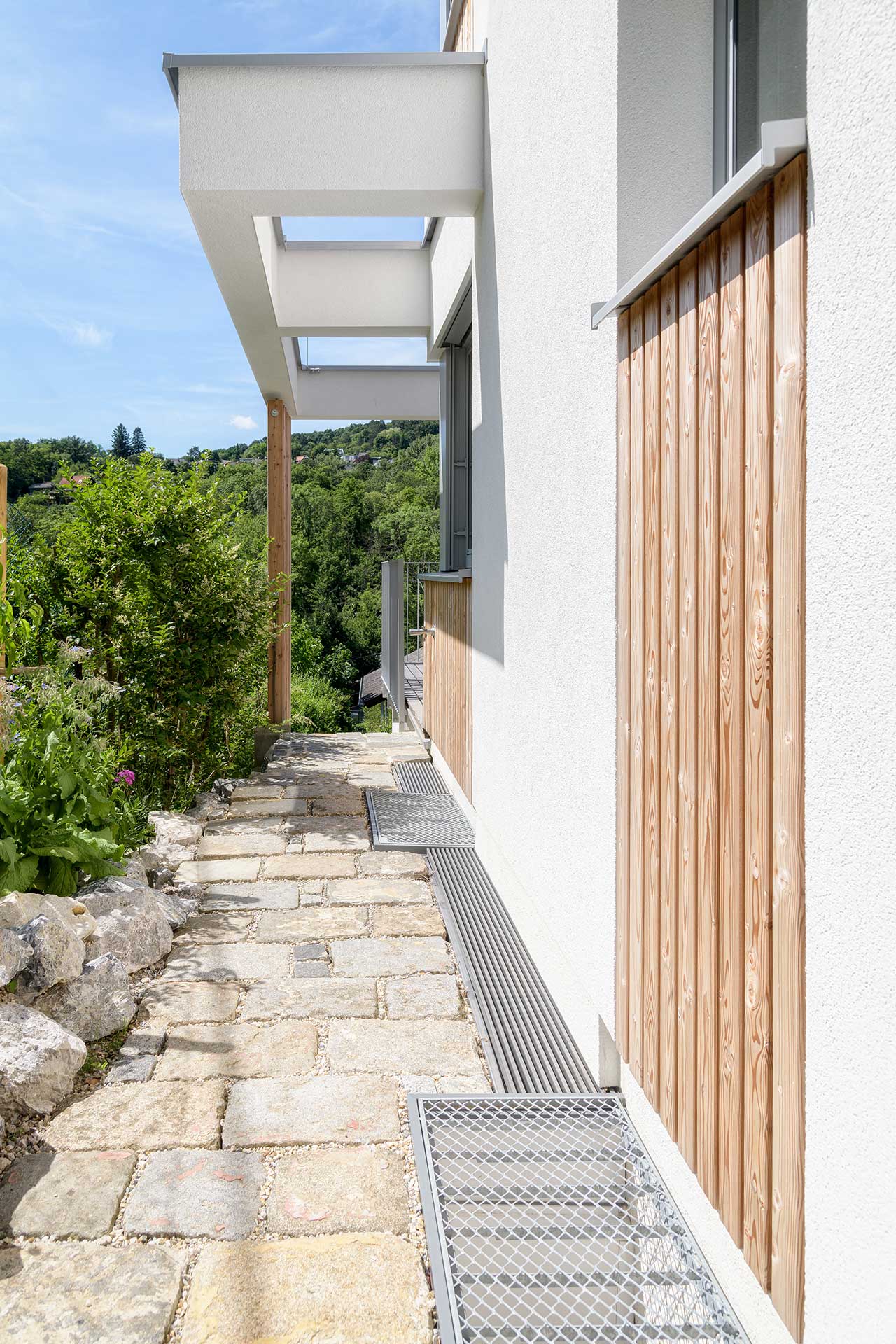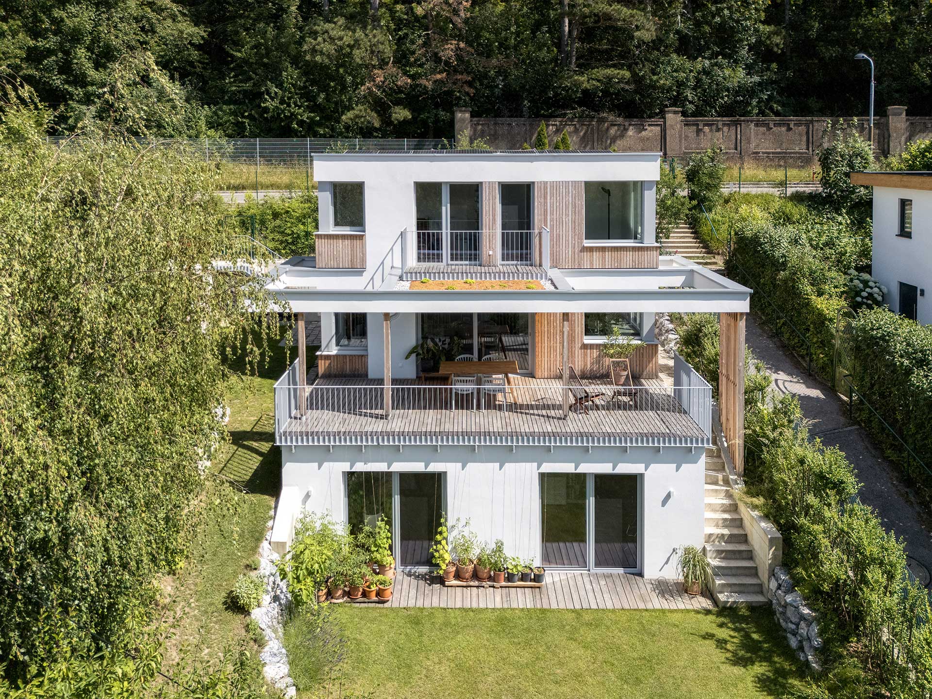 Dieses Kleingartenhaus begeistert mit einer Kombination aus Holzschalung und weißer Putzfassade. Der terrassenförmige Baukörper bietet großzügige, überdachte Bereiche und natürliche Holzbeläge auf Terrasse und Balkon – perfekt, um den Blick in den Wienerwald zu genießen. Eine PV-Anlage und ein Gründach runden das nachhaltige Konzept ab.